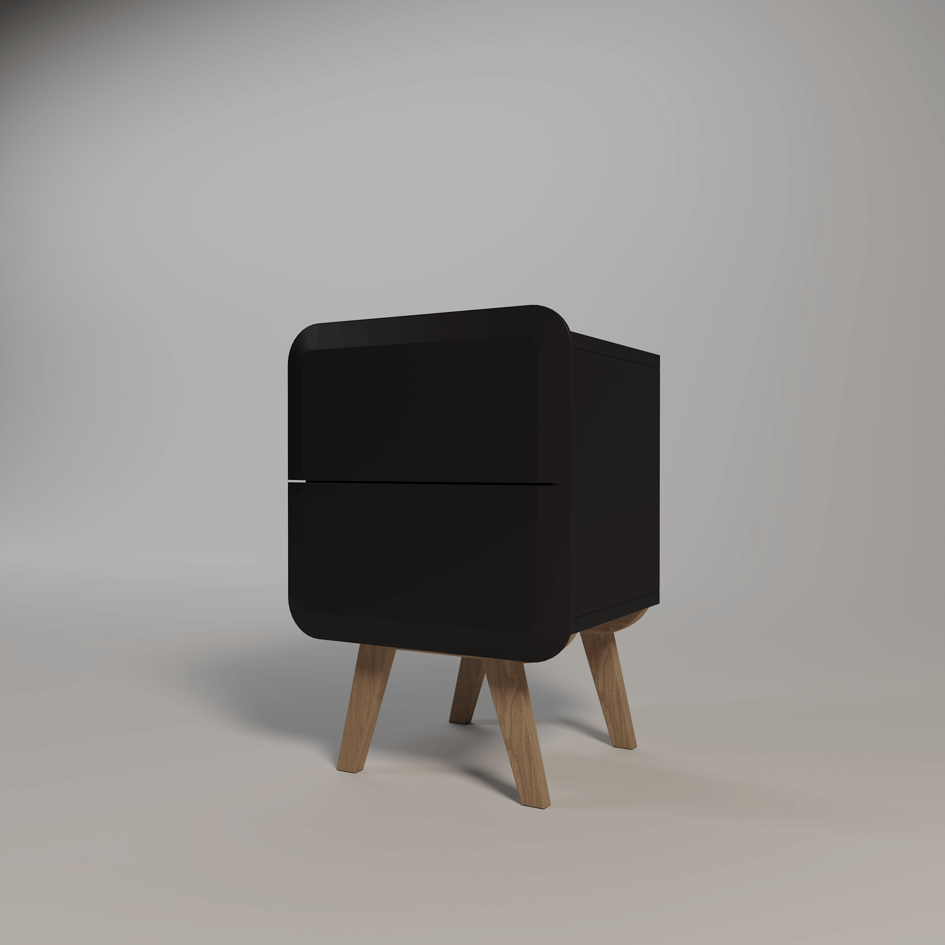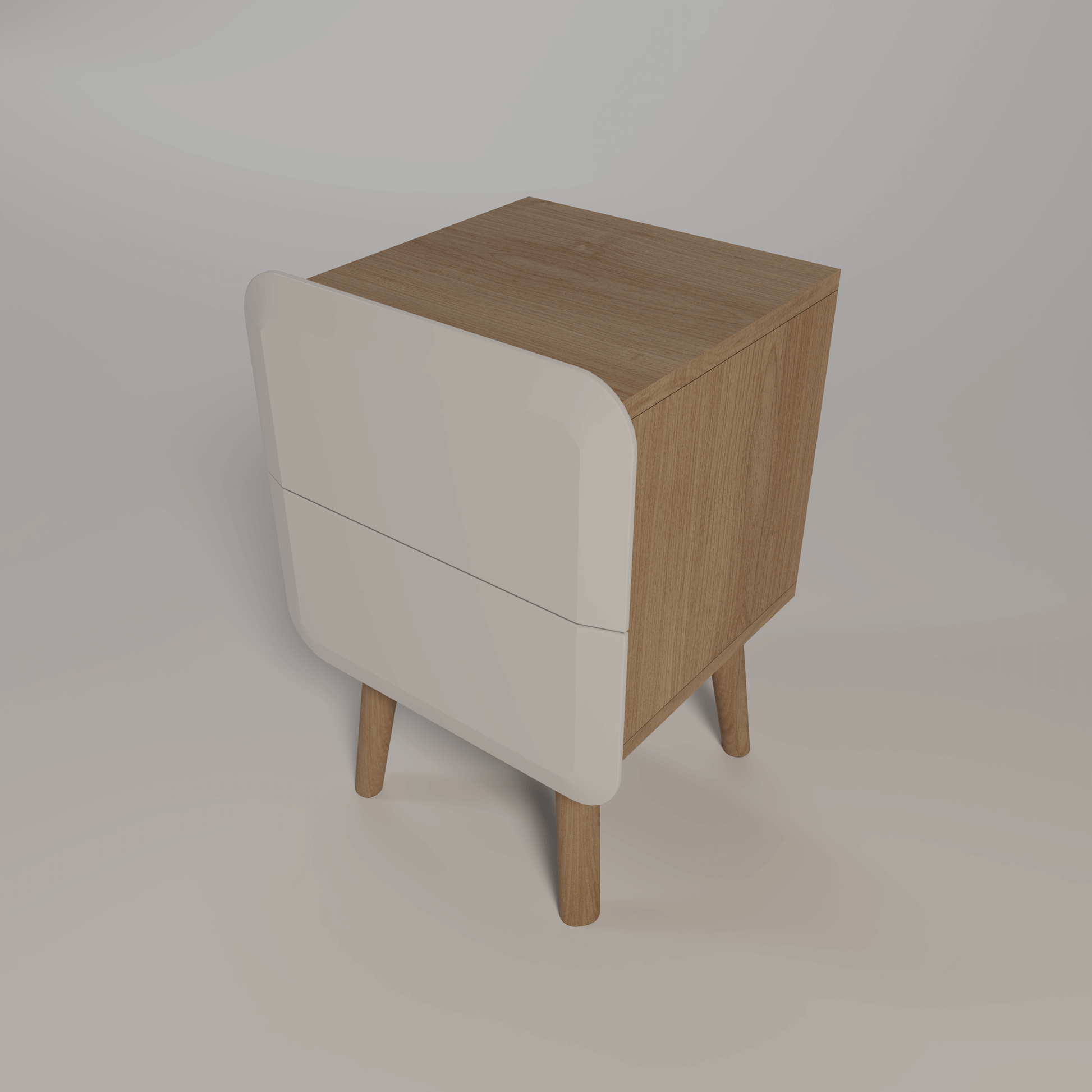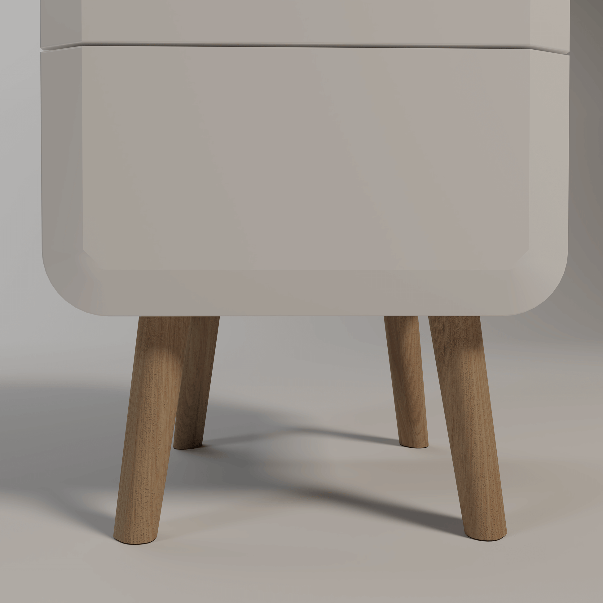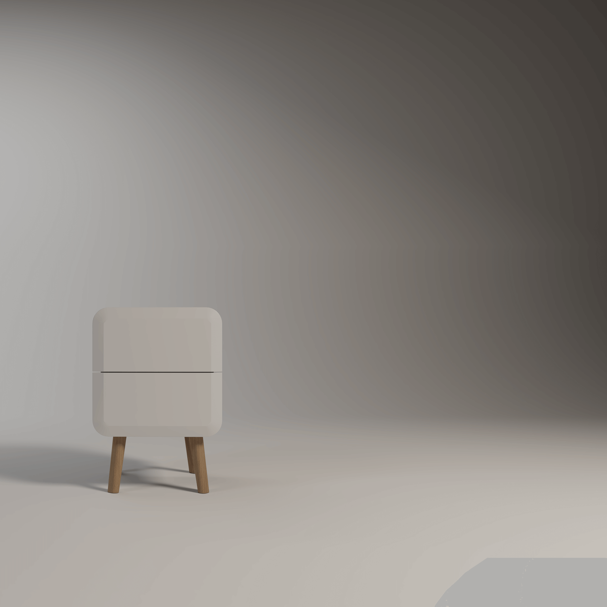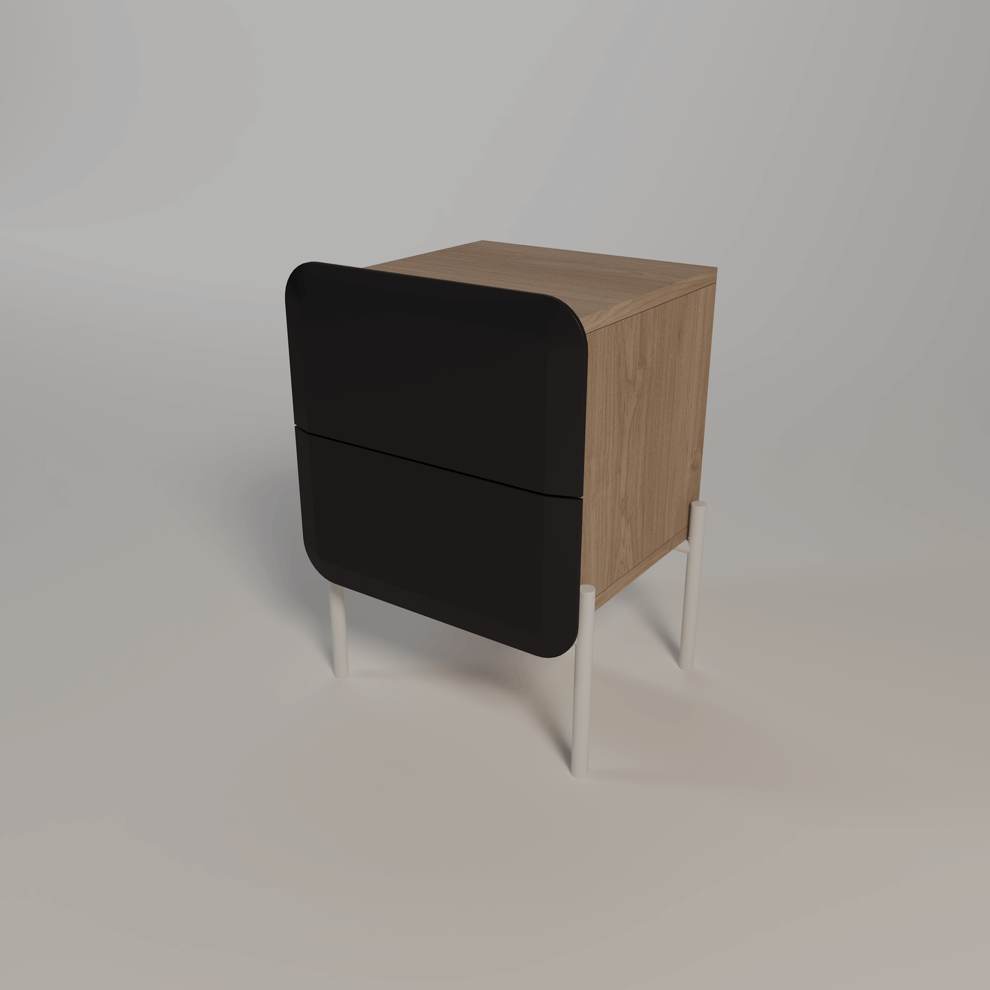 Der Nachttisch ist ein Möbelstück, mit dem Sie den Tag beginnen und beenden. Mit den abgerundeten Kanten der Schubladenfront und den auf Gehrung gearbeiteten Korpusverbindungen folgt dieses Stück der Designlinie der Kollektion. Zwei Schubladen sind in den Nachttisch integriert, um Ihre wichtigsten Dinge aufzubewahren. Der Korpus besteht aus Eichenfurnier, die Beine sind aus Massivholz gefertigt, was Festigkeit und Stabilität gewährleistet. Dank unseres Konfigurators können Sie die Farbe und Textur wählen, die am besten zu Ihrem Raum passt.