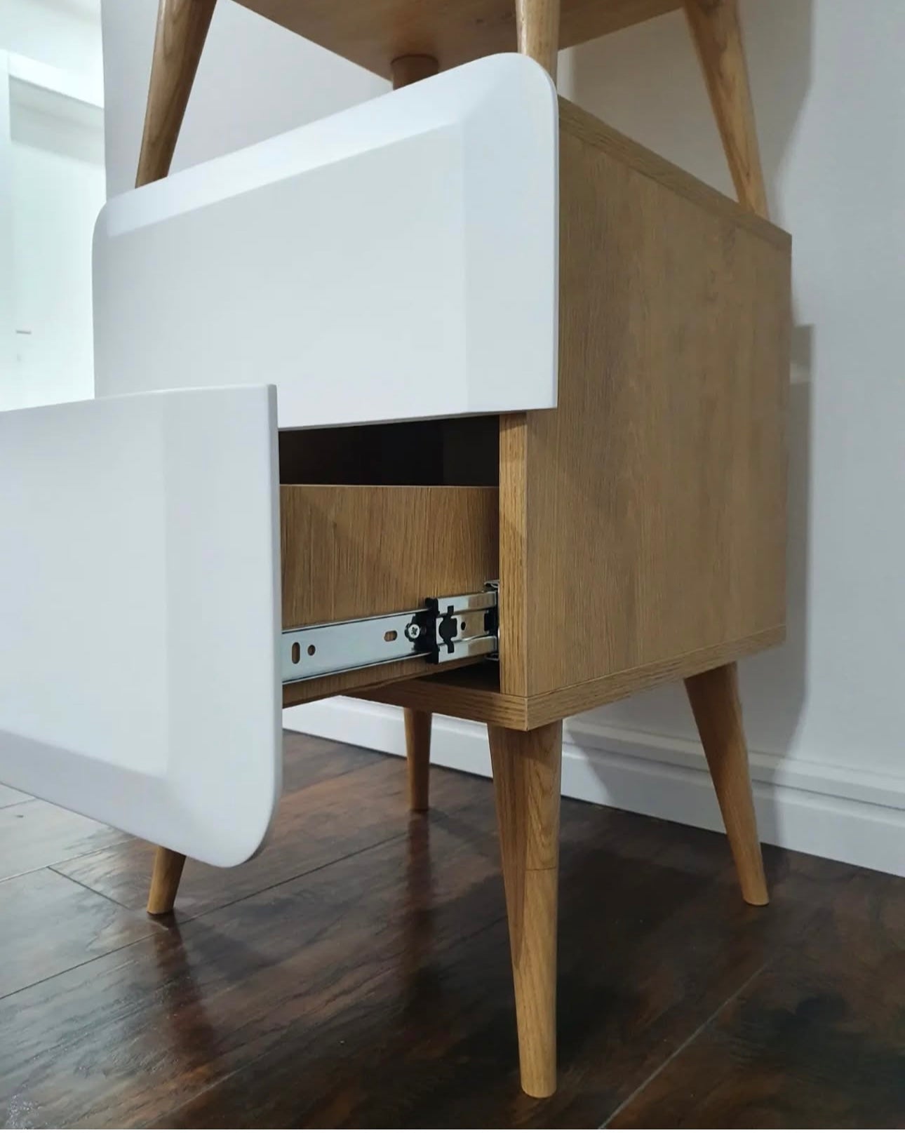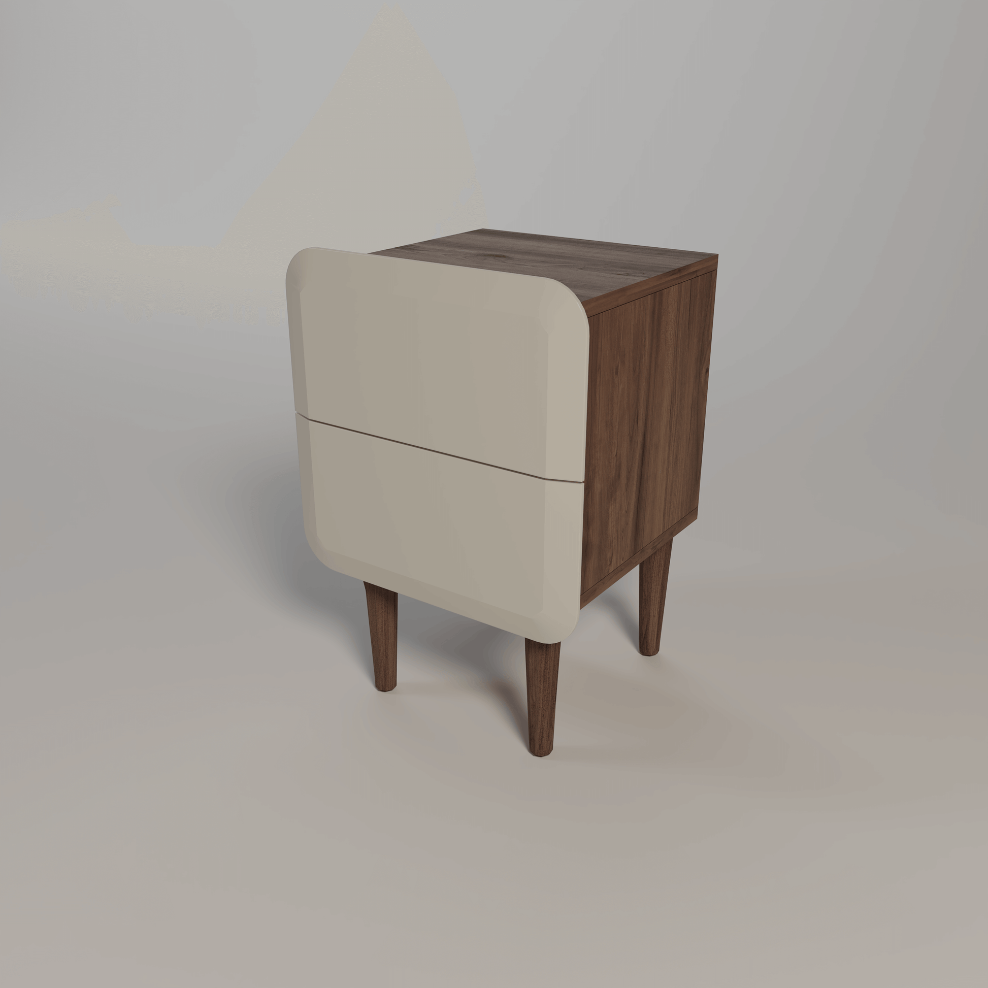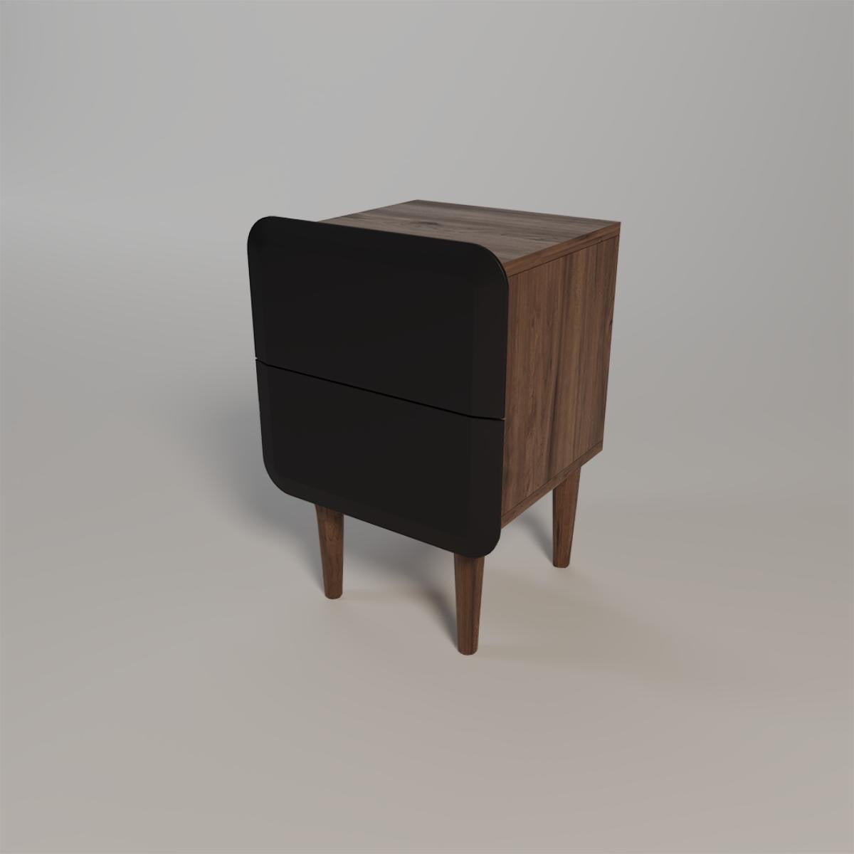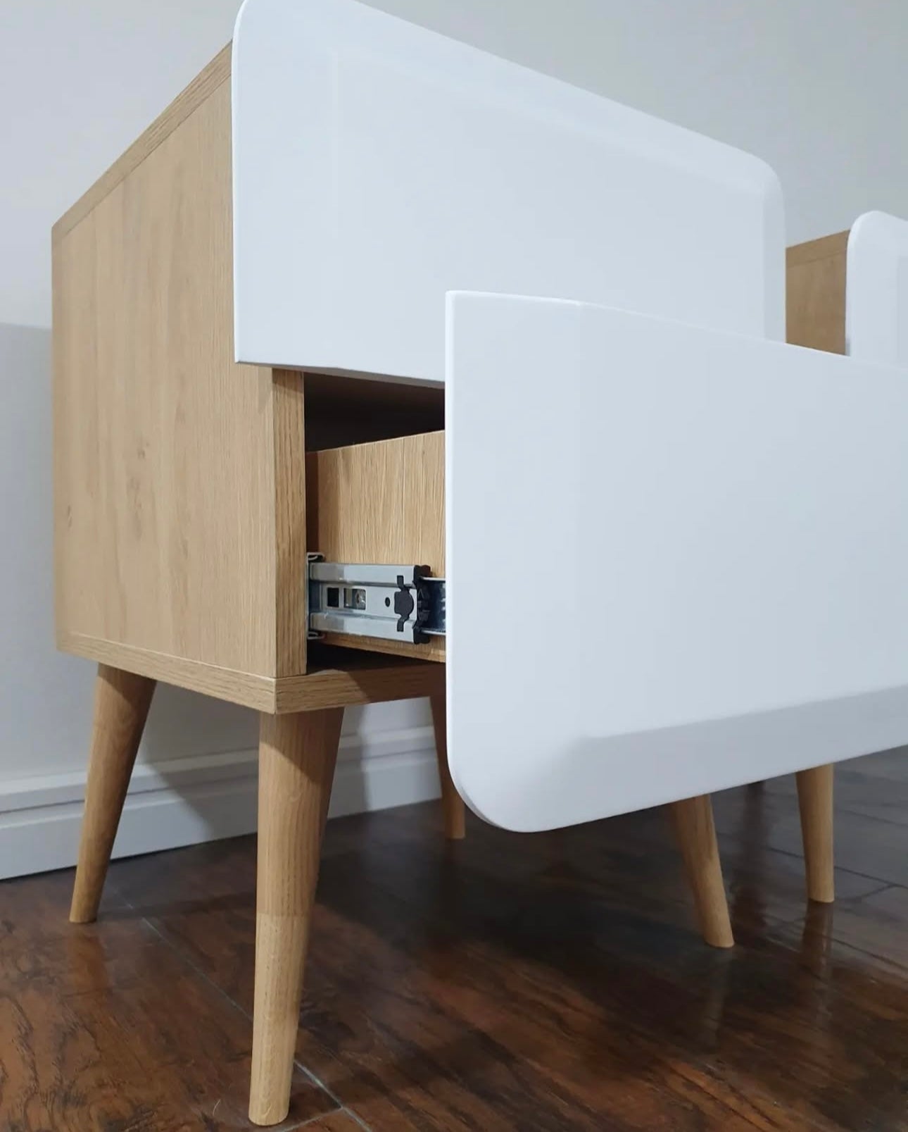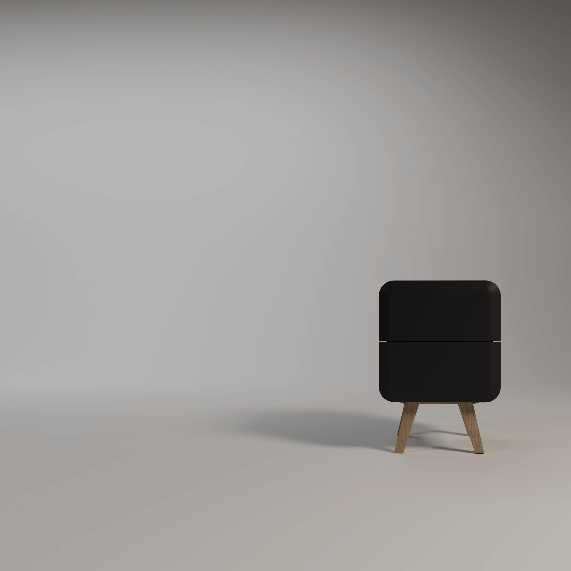 Der Nachttisch ist ein Möbelstück, mit dem Sie den Tag beginnen und beenden. Mit den abgerundeten Kanten der Schubladenfront und den auf Gehrung gearbeiteten Korpusverbindungen folgt dieses Stück der Designlinie der Kollektion. Zwei Schubladen sind in den Nachttisch integriert, um Ihre wichtigsten Dinge aufzubewahren. Der Korpus besteht aus Eichenfurnier, die Beine sind aus Massivholz gefertigt, was Festigkeit und Stabilität gewährleistet. Dank unseres Konfigurators können Sie die Farbe und Textur wählen, die am besten zu Ihrem Raum passt.