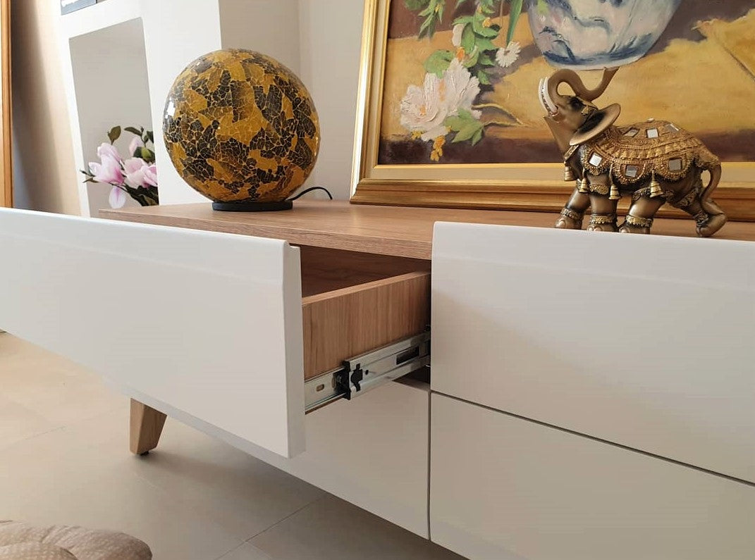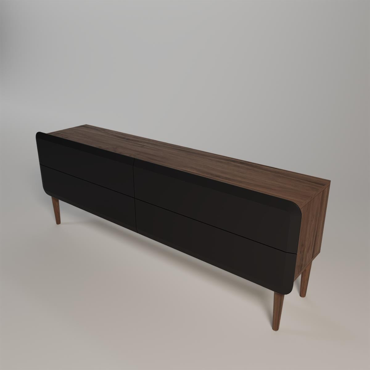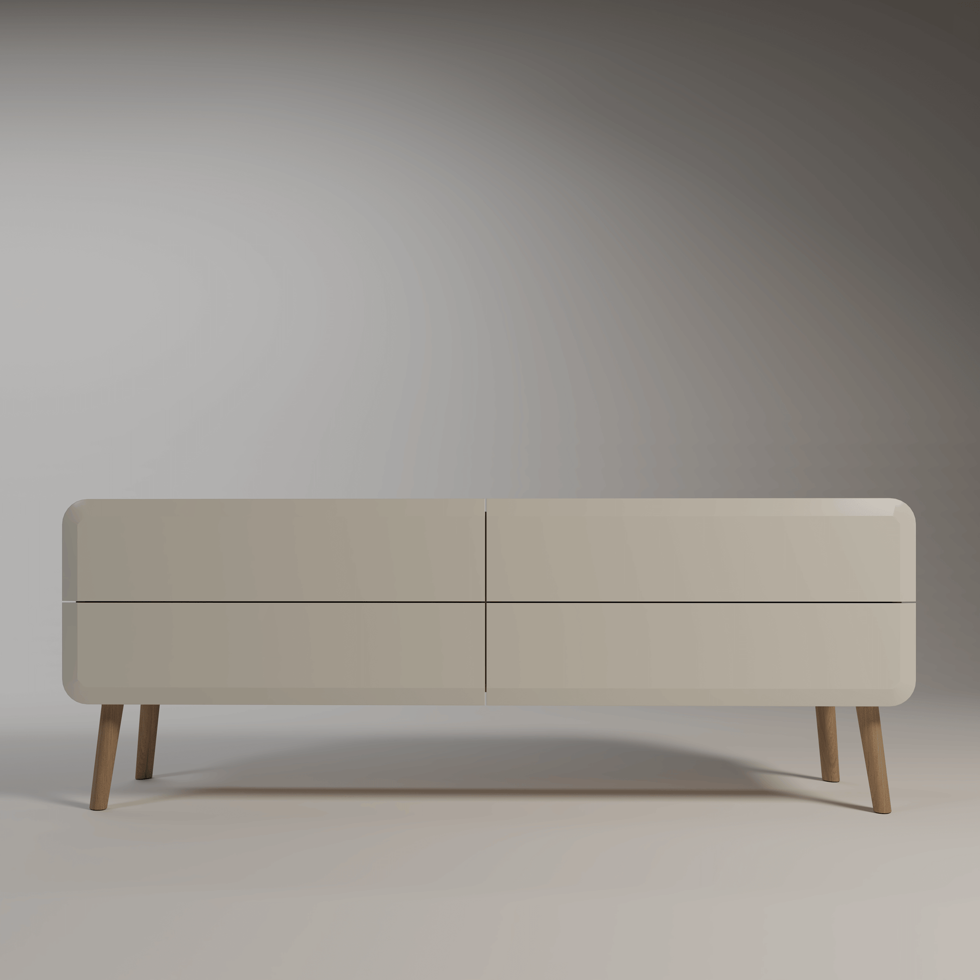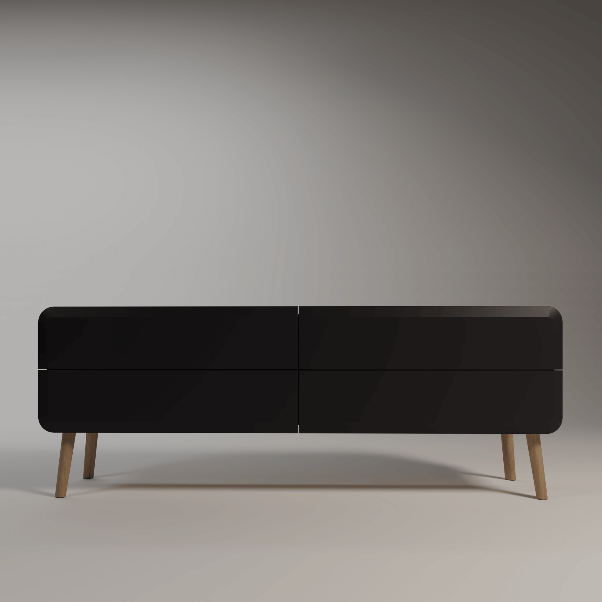 Das TV-Lowboard fügt sich perfekt in Ihr Wohnzimmer ein, wenn ein harmonisches und modernes Erscheinungsbild wichtig ist. Mit abgerundeten Kanten und auf Gehrung gefertigten Korpusverbindungen wirkt das TV-Lowboard ordentlich und ausgewogen. Der Korpus besteht aus furniertem MDF, die Beine sind aus Massivholz gefertigt, was Festigkeit und Stabilität gewährleistet. Die Fronten der Schubladen bestehen aus lackiertem MDF, und das Lowboard verfügt über vier geräumige Schubladen für alles, was Sie gerne griffbereit, aber nicht sichtbar aufbewahren möchten. Dank unseres Konfigurators können Sie die Farbe und Variante wählen, die am besten zu Ihrem Raum passt.